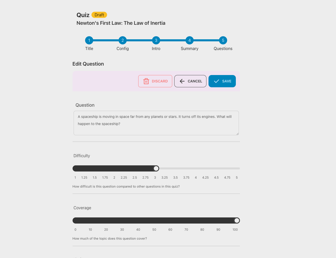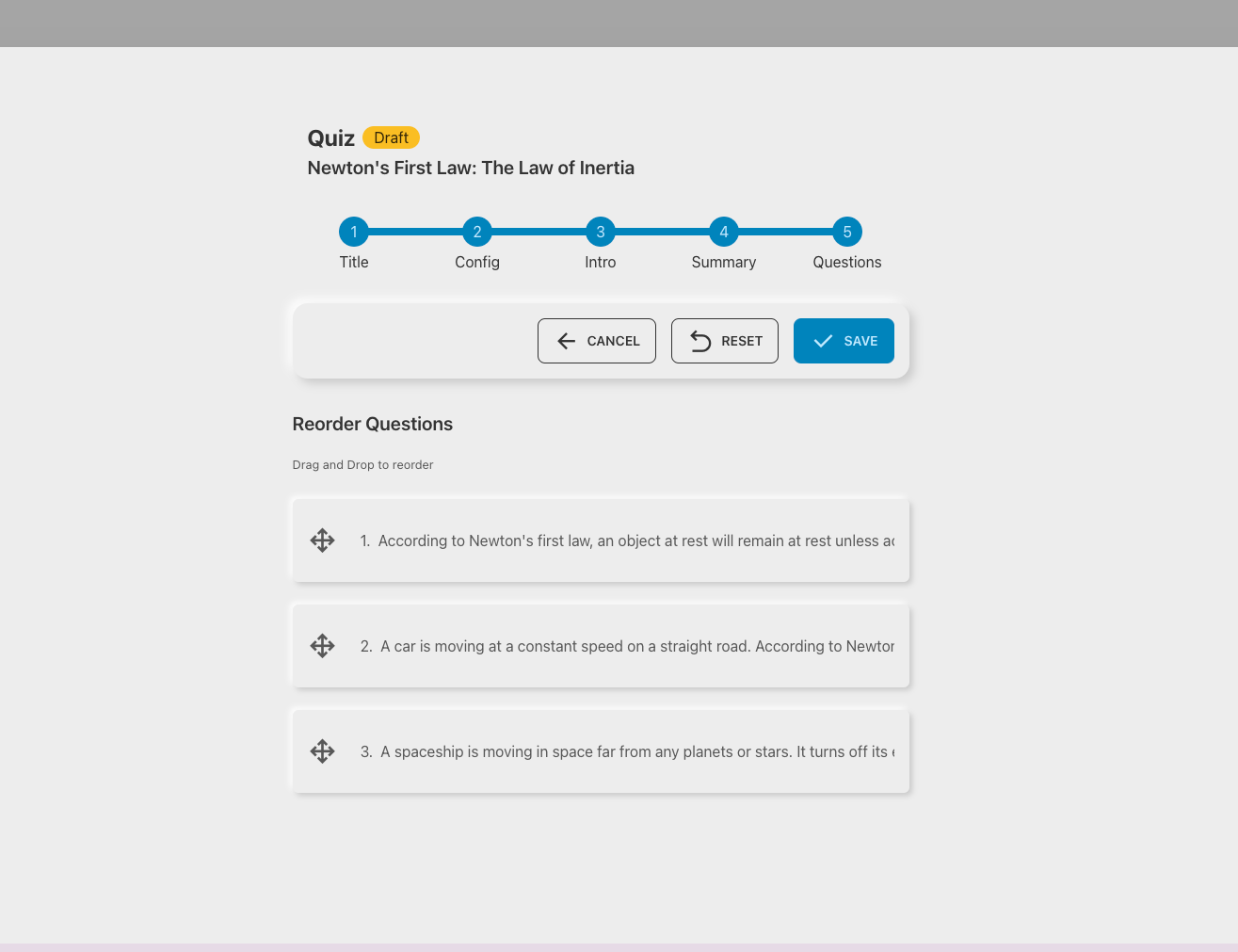 You can reorder the questions by dragging and dropping them. You can also edit the generated questions, their difficulty, coverage, choices and explanation for each of the choices.