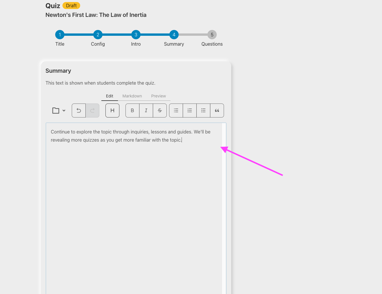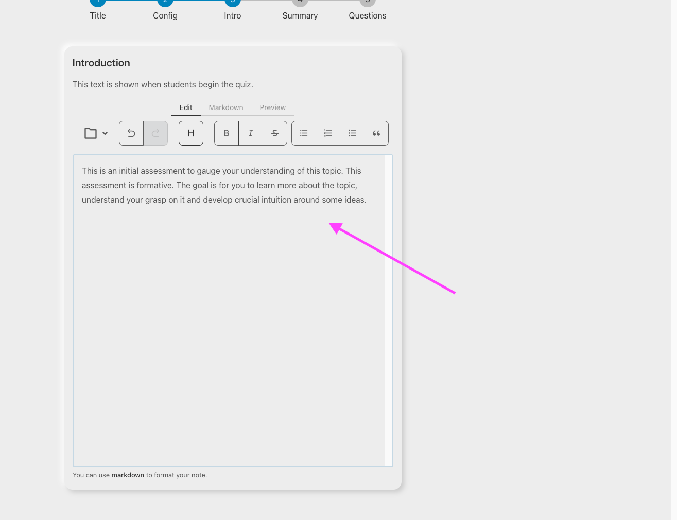 The first step is to enter a title for the quiz and optionally specifying the intent. While it is optional, adding the intent ensures that the quiz is aligned with your objectives as a teacher. You can also add a line that specifies if you want the quiz to be formative, normative or summative.