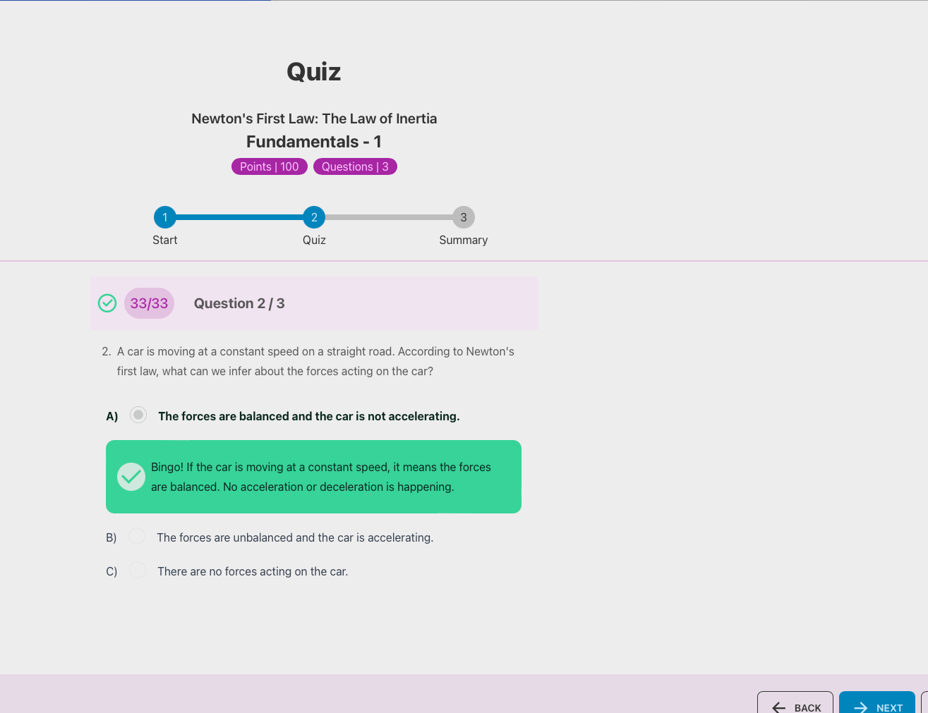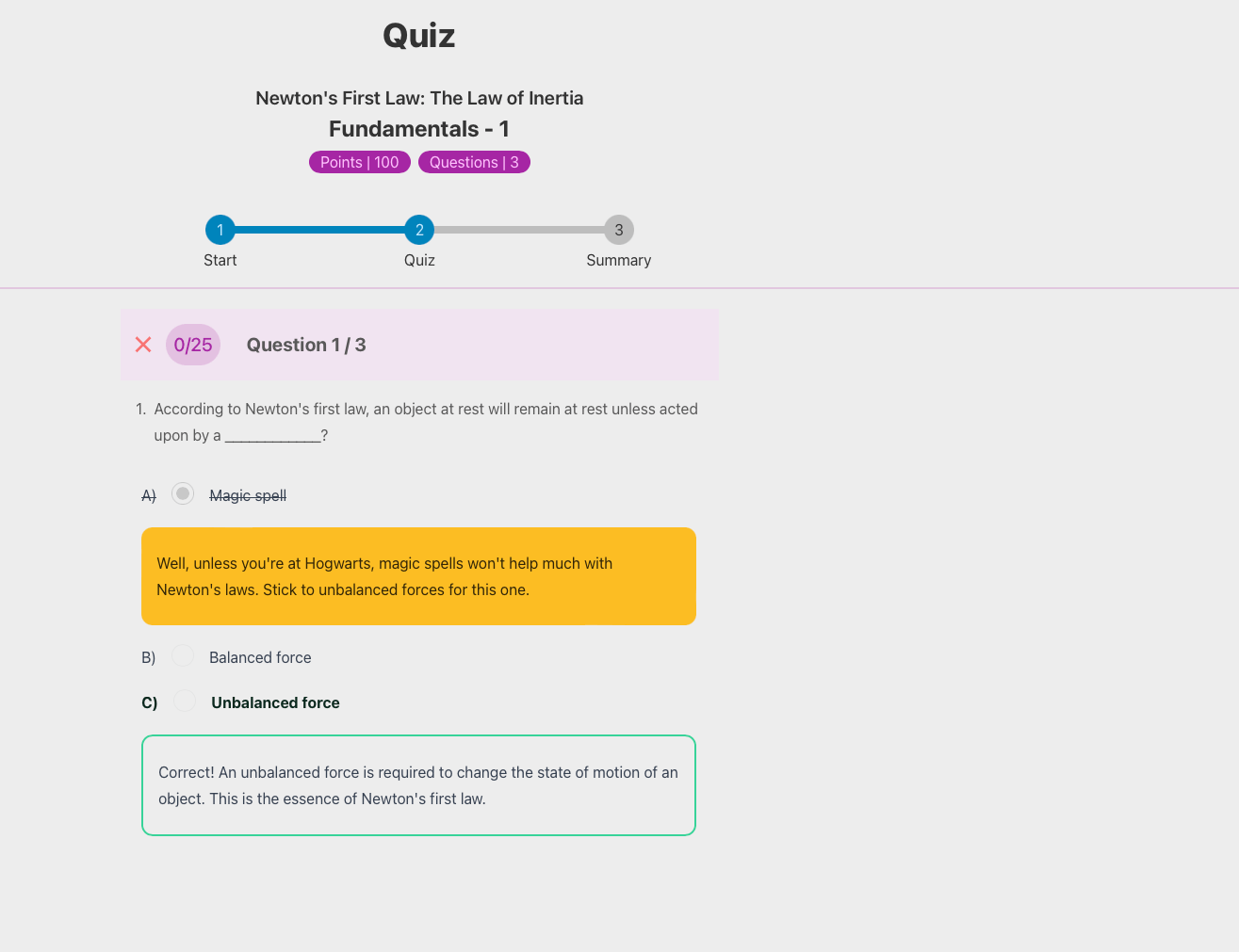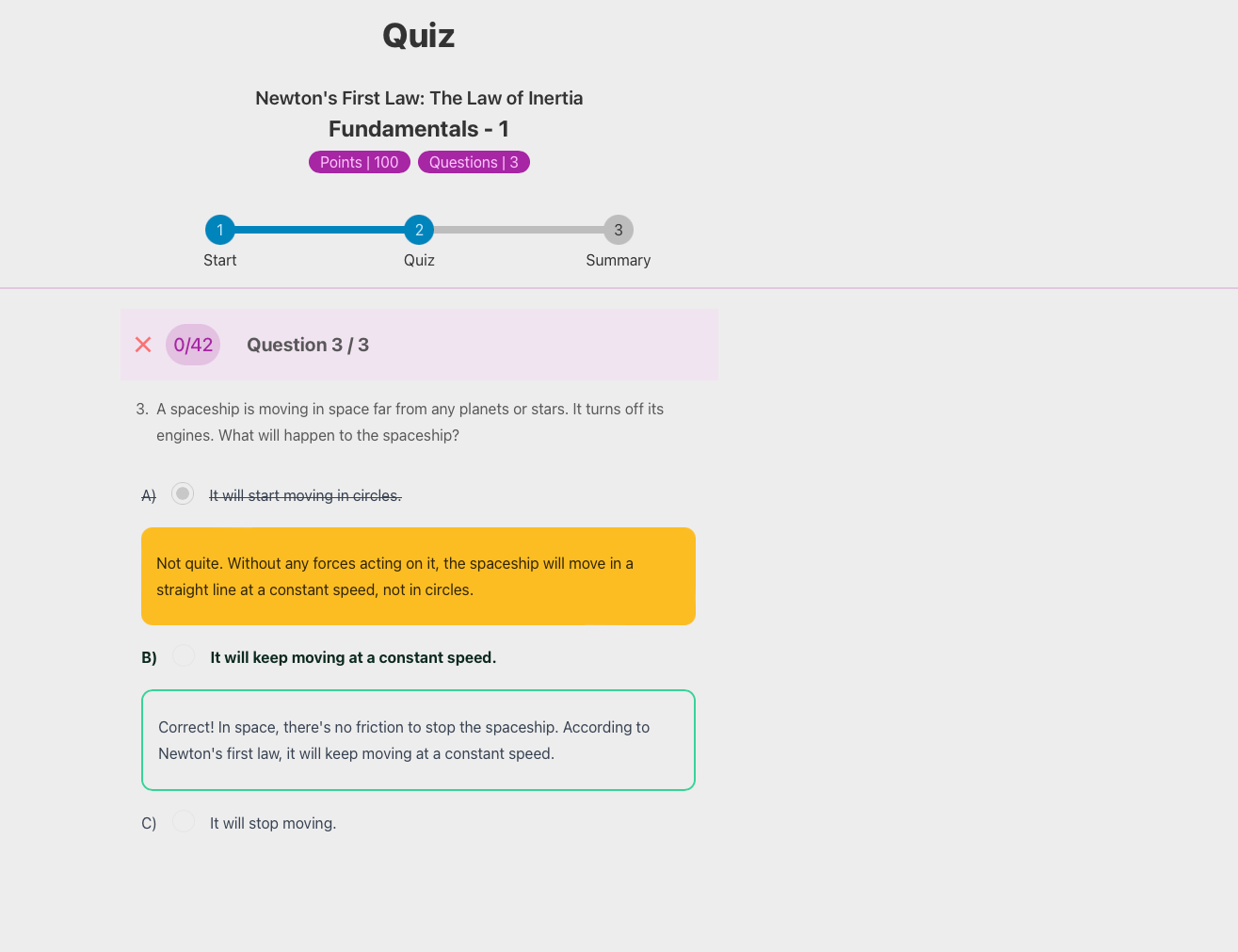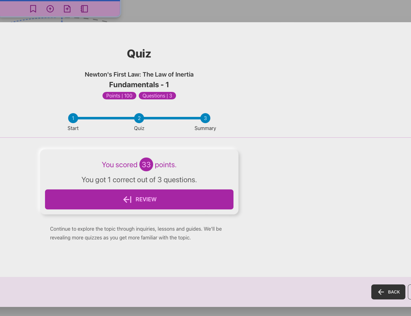 Reviewing the quiz is instructional with explanations for their choice and the correct response added in. The quiz also gets its own stars just like the topic mastery score.