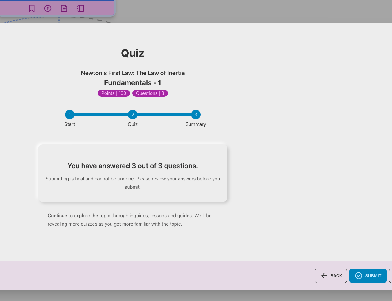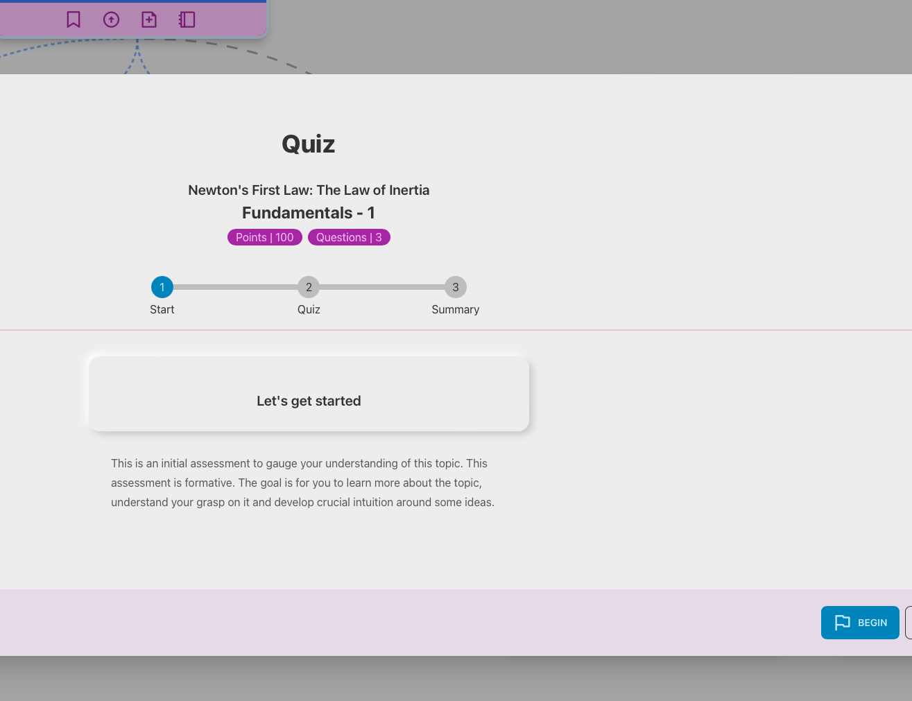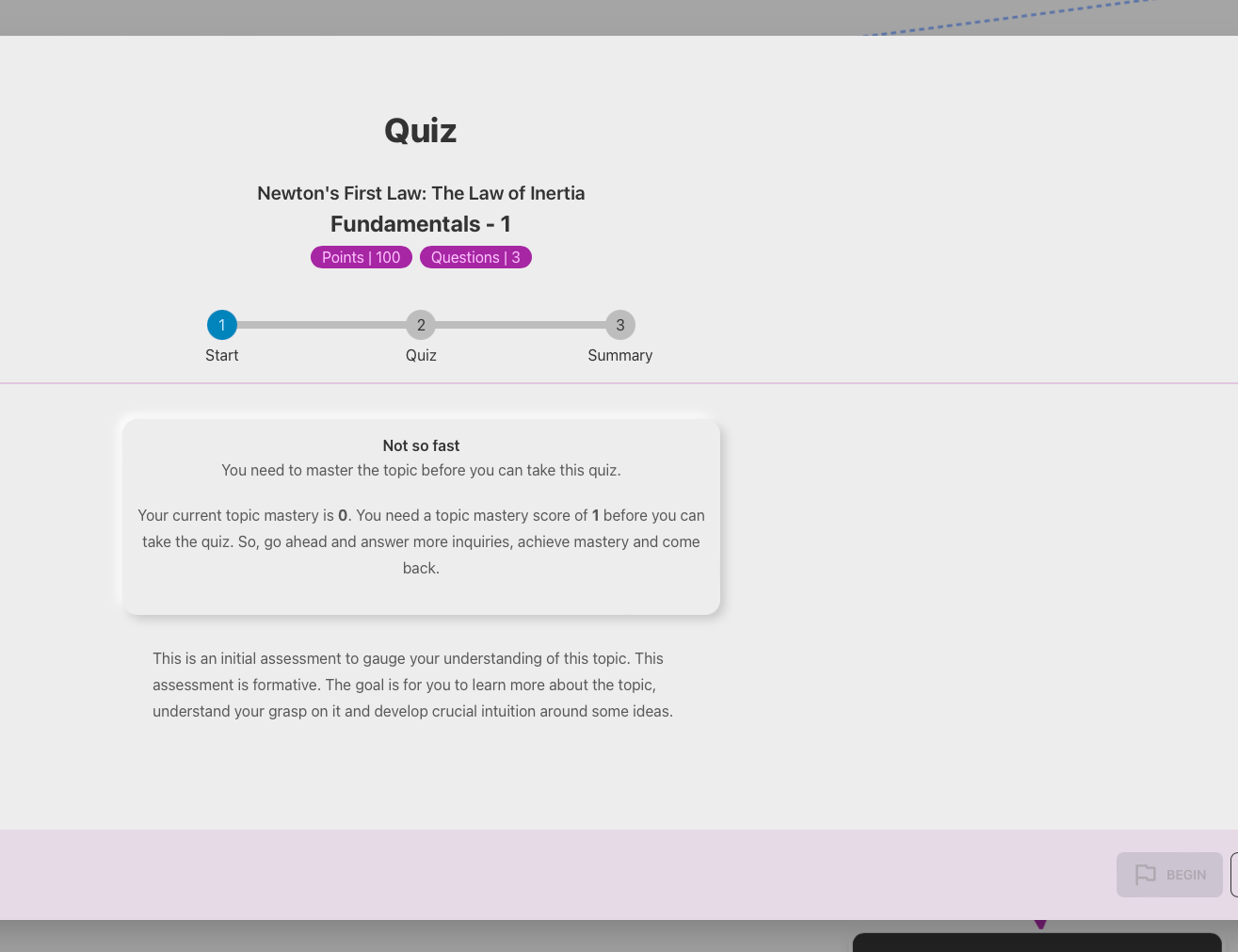 Once the teacher publishes or updates their exploration and makes an assignment, the student is ready to take the quiz. Well, almost. They cannot take the quiz until they get to the required topic mastery of 1. It’s not a big ask and can be completed by answering just one inquiry.