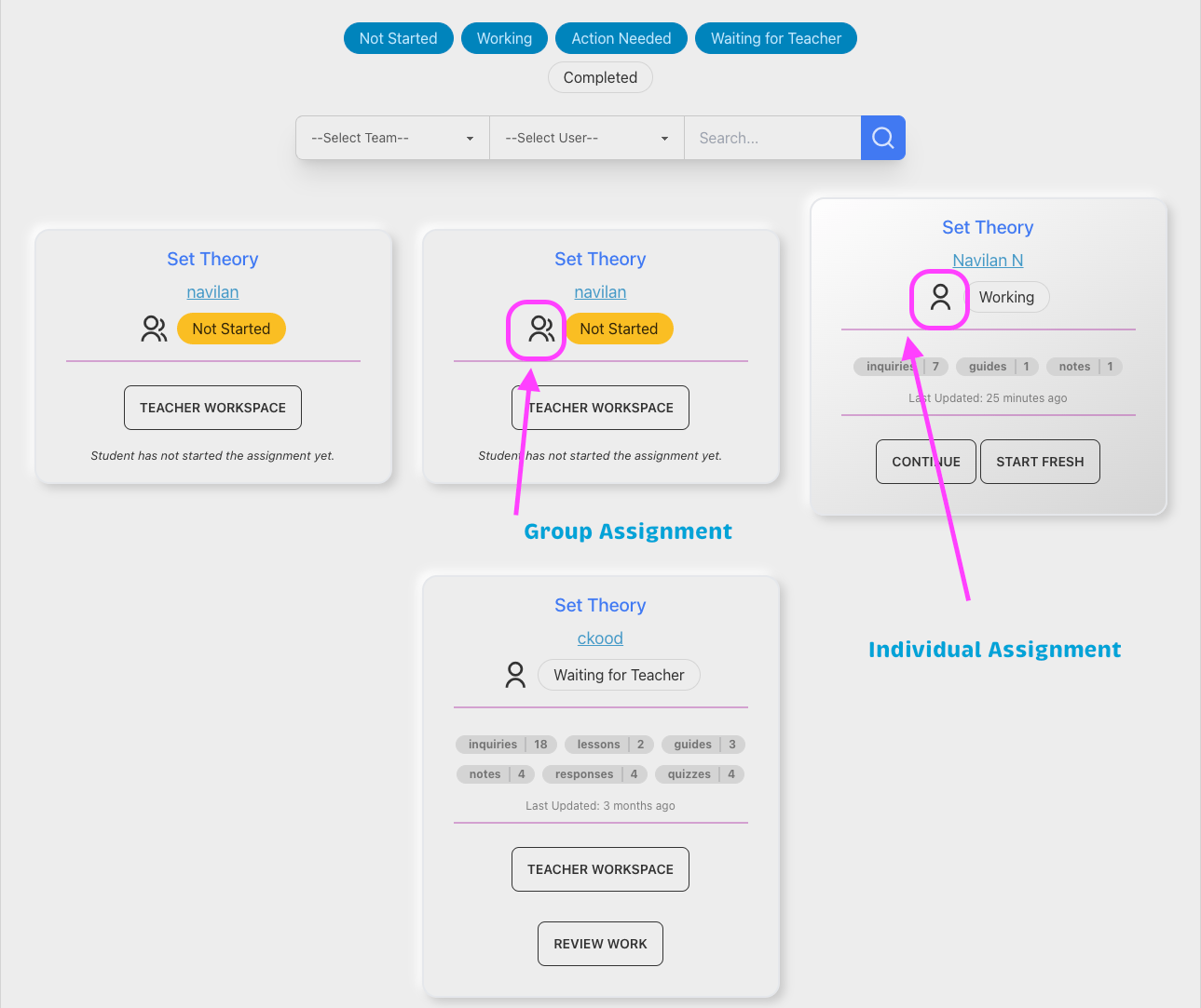 SocratiQ 0.5 plugs a big gap between our vision and execution. In order to have group assignments, teachers had to create an assignment and then share the join code with other students. This friction has now been eliminated. The group assignment workflow is as smooth as individual assignments. You can even mix and match as long as you create distinct teams.