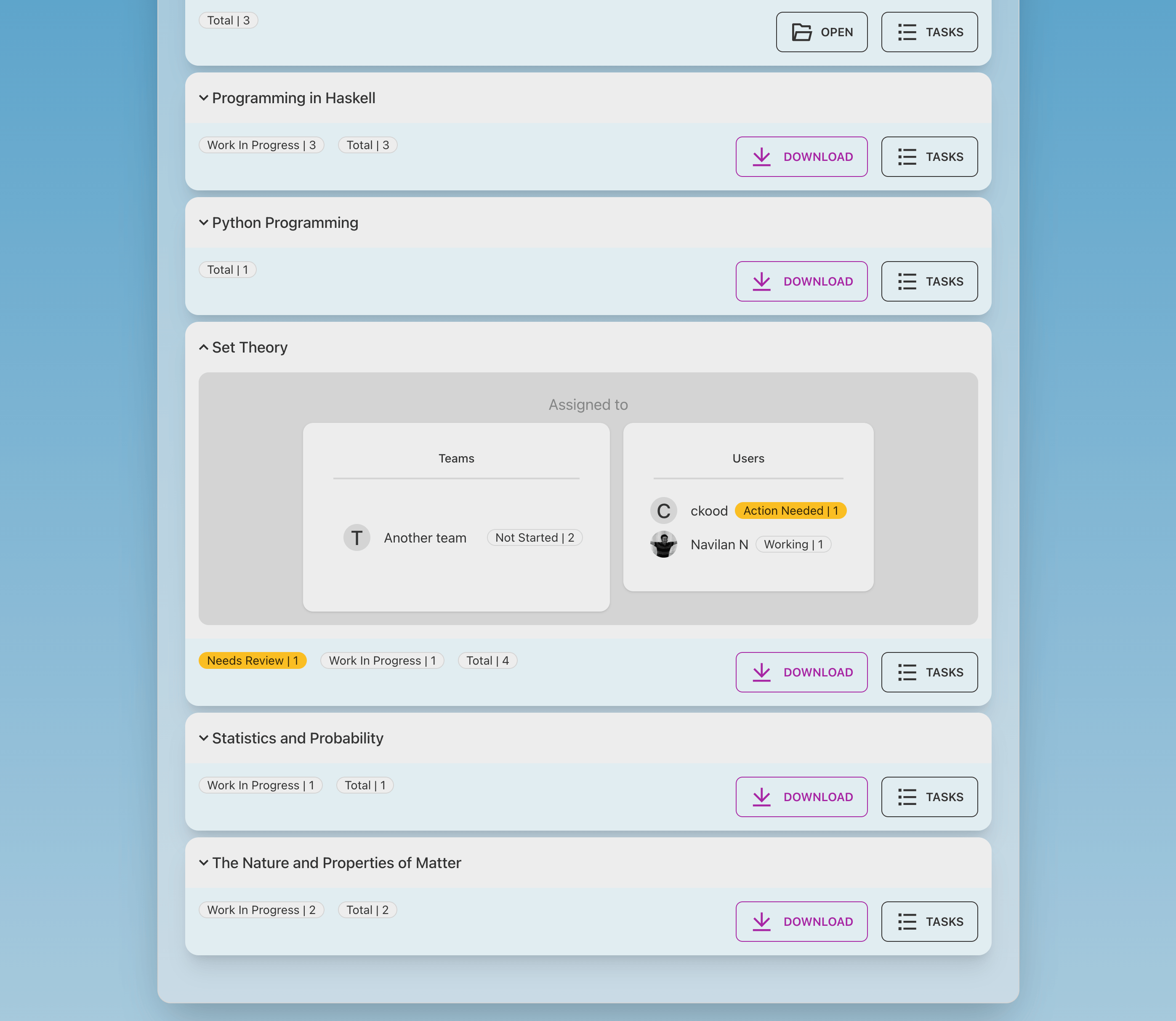 When you have a class of 60 students, reviewing assignments can be a daunting task. Bubbling up the assignments that need attention makes things a lot easier for the teachers. To address this, we have now split the assignment view in to assignment overview and the individual tasks. The overview has statuses and counts to help teachers keep track of the assignments at a glance and redirect their attention to the ones that need the most.